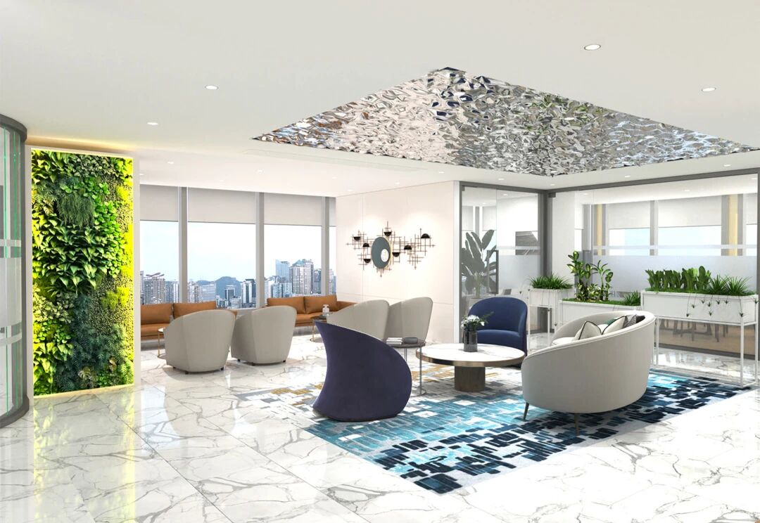 空間布局:強調功能性分區,如獨立的客戶接待區、VIP洽談室、辦公區等,確保私密性和高效性;接待室通常采用隔音材料(如吸音板、軟包墻面)打造安靜的洽談環境,體現對客戶隱私的重視;前廳設計注重大氣感,可通過造型燈帶、格柵天花等元素營造通透感,搭配大理石前臺和金屬裝飾,提升整體質感。