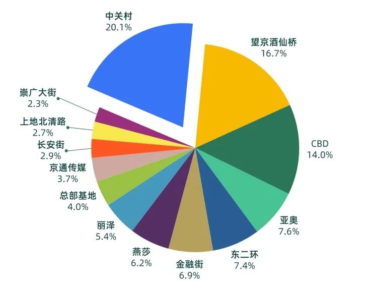 2022年第四季度的成交面積占比較高的商圈分別為中關村、望京酒仙橋及CBD。中關村商圈在本季度成交面積占比為全市寫字樓成交總面積的20.1%,望京酒仙橋商圈成交占比為16.7%,CBD商圈成交占比為14%。