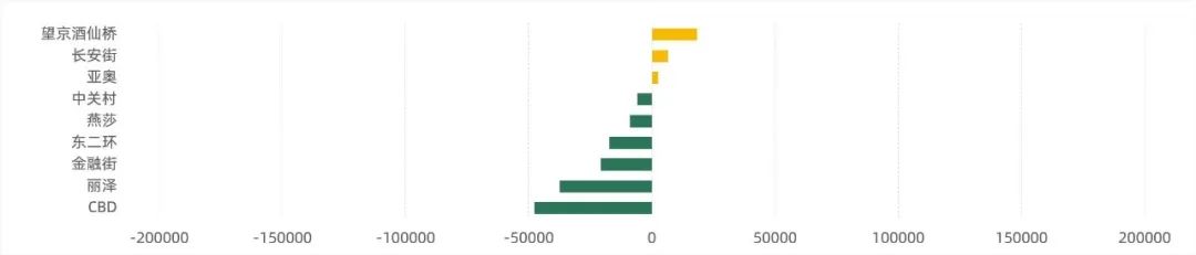 從各主要商圈成交面積環比變化來看,望京酒仙橋、長安街、亞奧商圈本季度成交面積有所增長,其他商圈成交面積環比上季度均呈現不同程度降低,其中CBD商圈降幅最為顯著。