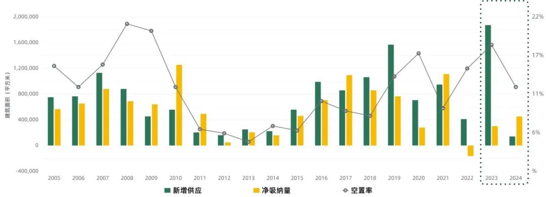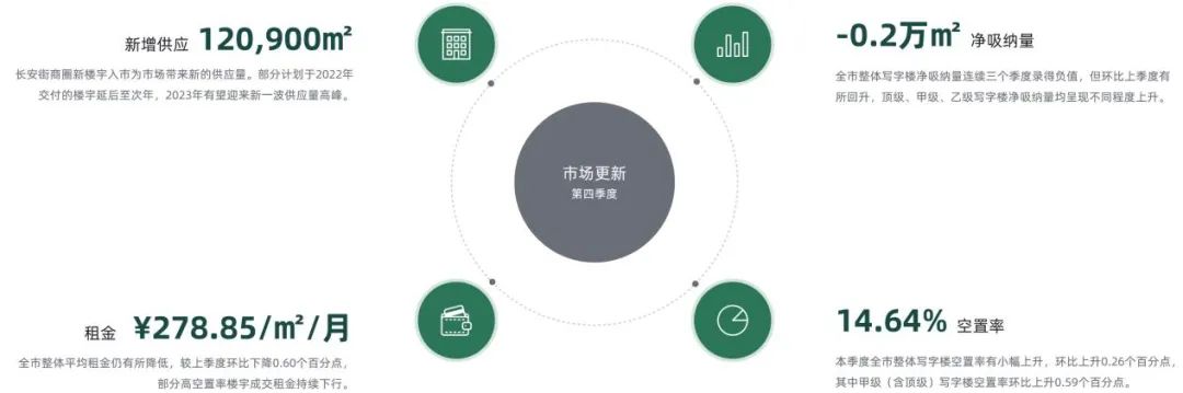 2022年第四季度全市整體寫字樓市場需求量有所回暖,但受疫情的持續影響,全市整體市場活躍度成交量依然錄得負值,全市整體寫字樓凈吸納量為-2,929平方米,其中甲級(含頂級)寫字樓凈吸納量為-15,377平方米,乙級寫字樓凈吸納量為12,448平方米,但全市整體寫字樓凈吸納量環比上季度上升69,800平方米。