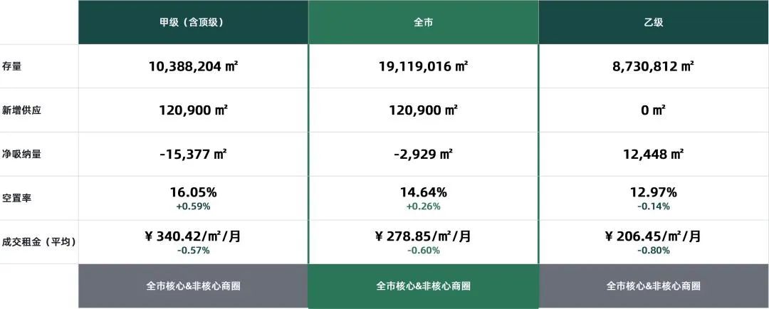 本季度全市整體(含頂級、甲級、乙級)成交租金未能止住收窄態勢,受疫情沖擊及宏觀經濟環境影響,已連續四個季度下行,市場承壓明顯,持續下行凸顯市場信心不足,全市整體租金最終錄得每平方米每月278.85元,環比下降0.6個百分點,其中甲級寫字樓為每平方米每月340.42元,環比下降0.57個百分點;乙級寫字樓為每平方米每月206.45元,環比下降0.8個百分點。