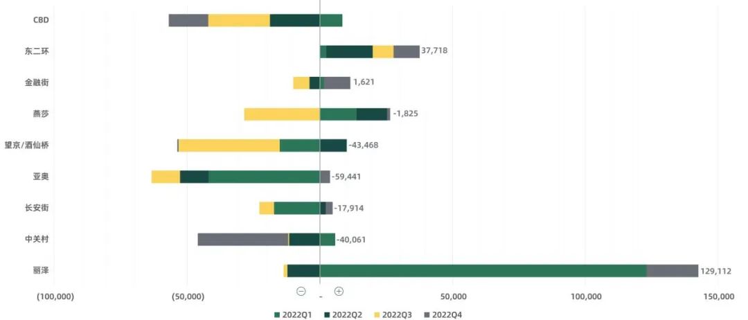 2022年第四季度全市整體存量有所增加,連續兩個季度無新增供應量之后,本季度迎來2個甲級寫字樓項目入市,分別為長安街商圈的王府77項目,以及通州商圈的新光大中心A5項目。兩個新項目的入市共為市場帶來約120,900平方米的新增供應量。