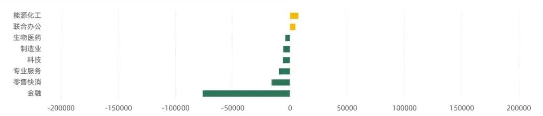 從行業成交面積環比變化來看,科技、金融行業本季度成交面積環比上季度降低共超9萬平方米,成交數量降幅分別為34.78%和30.43%,表現較為低迷;僅能源化工及聯合辦公行業成交面積環比上季度有所上升。