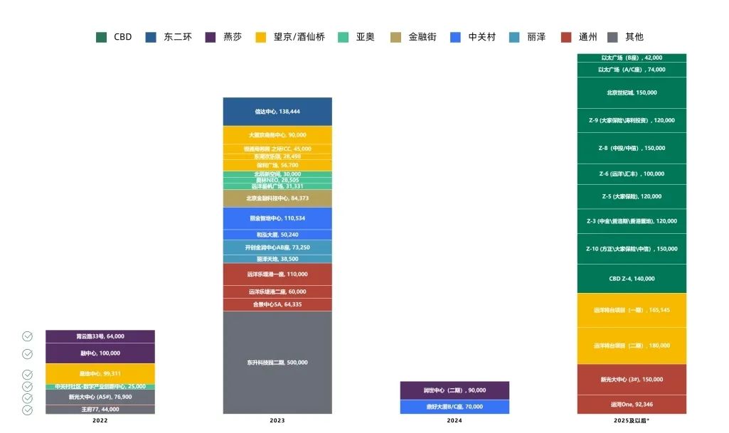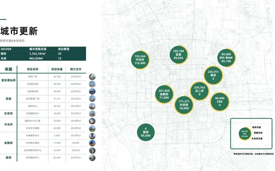 在2023年至2024年,除大量標準寫字樓產品項目集中入市外,還將有多個城市更新項目投入市場,就森裕咨詢統計數據顯示(見上表),未來2年將有超過46萬平方米的城市更新項目入市,分別集中在望京酒仙橋、亞奧、長安街、中關村、金融街以及麗澤等商圈,這也將為企業帶來更多產品選擇的空間。