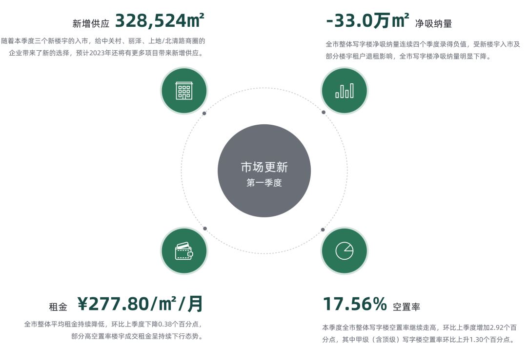 2023年第一季度受國內(nèi)經(jīng)濟(jì)復(fù)蘇、疫情結(jié)束管控放開影響,租賃需求在春節(jié)后雖有所反彈,吸納量環(huán)比上季度亦有所增加,但新項目的入市及部分樓宇租戶陸續(xù)退租使空置率仍未止住上行趨勢。