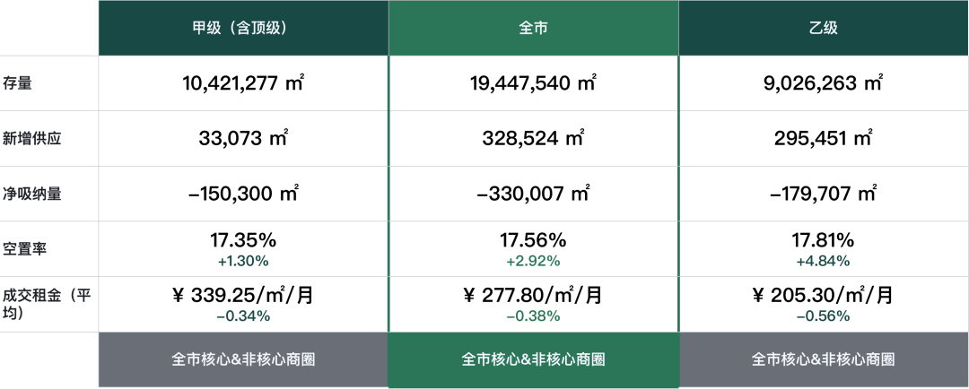 其中甲級(含頂級)寫字樓成交租金環(huán)比下降0.34 個百分點(diǎn),為每平米每月 339.25 元;乙級寫字樓成交租金環(huán)比下降 0.56 個百分點(diǎn),錄得每平米每月 205.30 元。