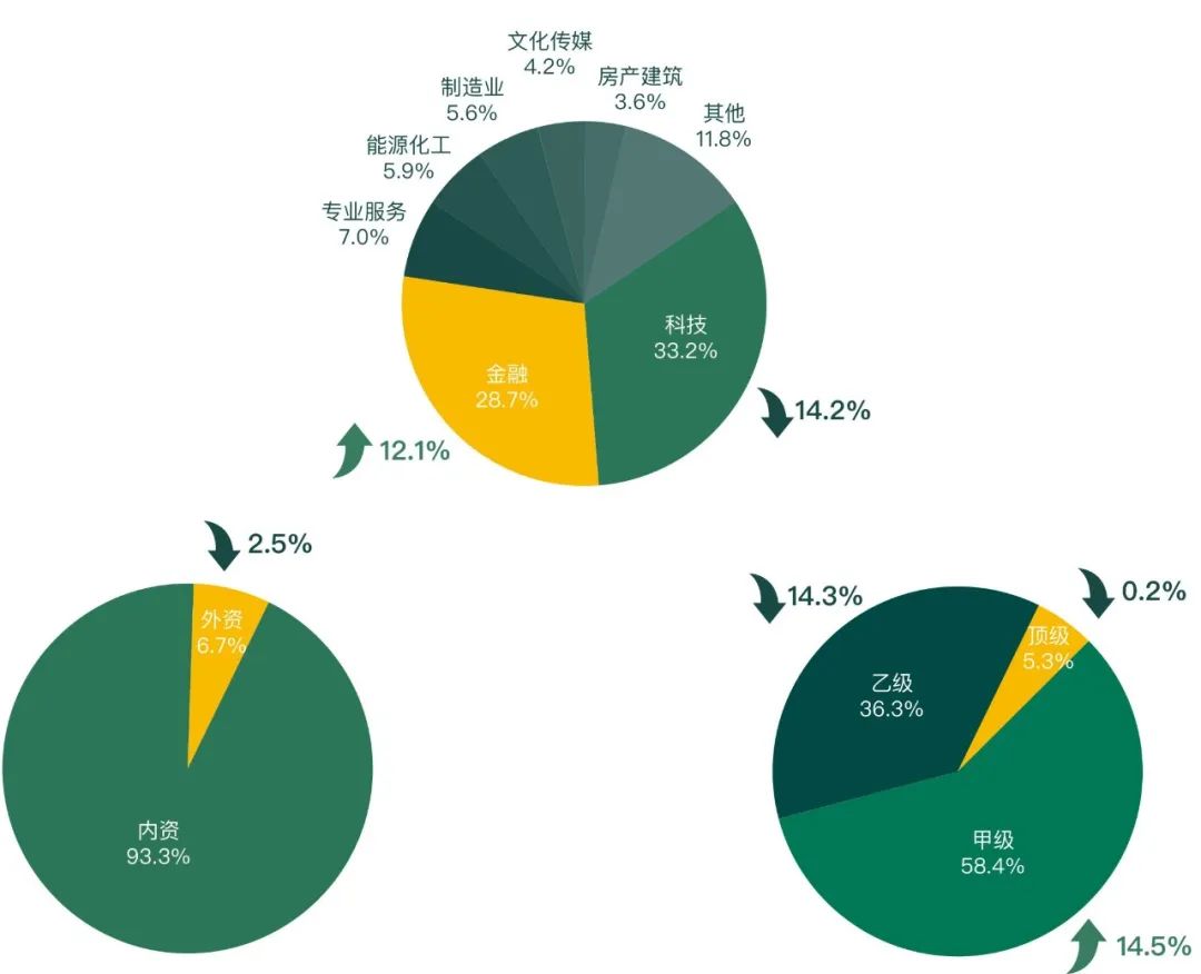 科技、金融、專業(yè)服務(wù)行業(yè)始終是市場成交的主要來源;金融行業(yè)成交面積占比上升 12.1 個百分點(diǎn),科技行業(yè)成交面積占比下降明顯,降低約 14.2 個百分點(diǎn)。