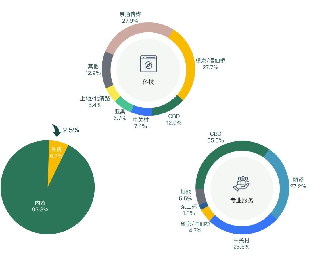 2023年第一季度科技行業(yè)在京通傳媒及望京/酒仙橋商圈成交面積占比顯著,占比超過全市的五成,CBD、中關(guān)村等商圈也有該類企業(yè)落位。