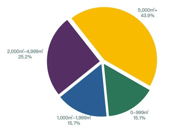 從2023 年第一季度寫字樓成交面積來看,本季度 5,000 平方米以上的成交面積占比最大,為 43.9% ;超過 2,000 平方米且在 5000 平方米以內(nèi)的成交面積占比超過全市成交面積的四分之一,為 25.2% 。