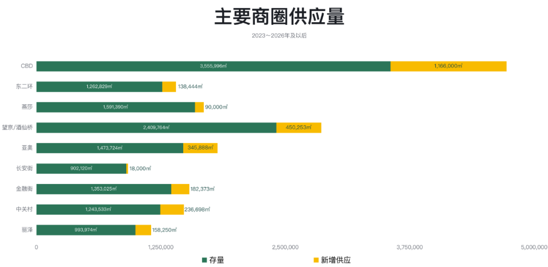 在2023-2026 年,全市主要商圈新增供應(yīng)量主要集中在 CBD 、望京 / 酒仙橋與亞奧商圈。金融街、中關(guān)村、麗澤和東二環(huán)商圈也將有新的寫字樓項目陸續(xù)投入市場。