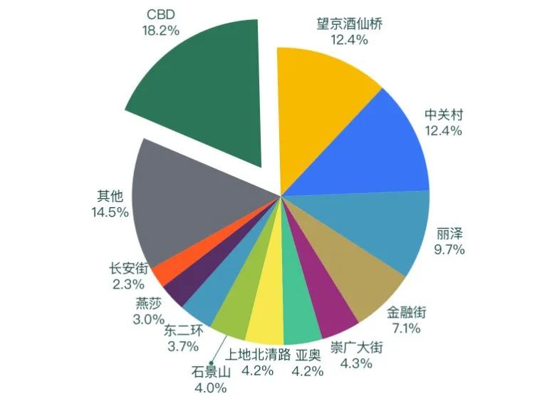 2023年第一季度, CBD 、望京 / 酒仙橋、中關(guān)村、麗澤是本季度成交的熱點(diǎn)區(qū)域,占比超過全市成交面積的 50% 。 CBD 商圈在本季度成交面積占比為 18.2% ,望京 / 酒仙橋、中關(guān)村商圈成交面積占比均為 12.4% ,麗澤商圈成交面積占比為 9.7% 。