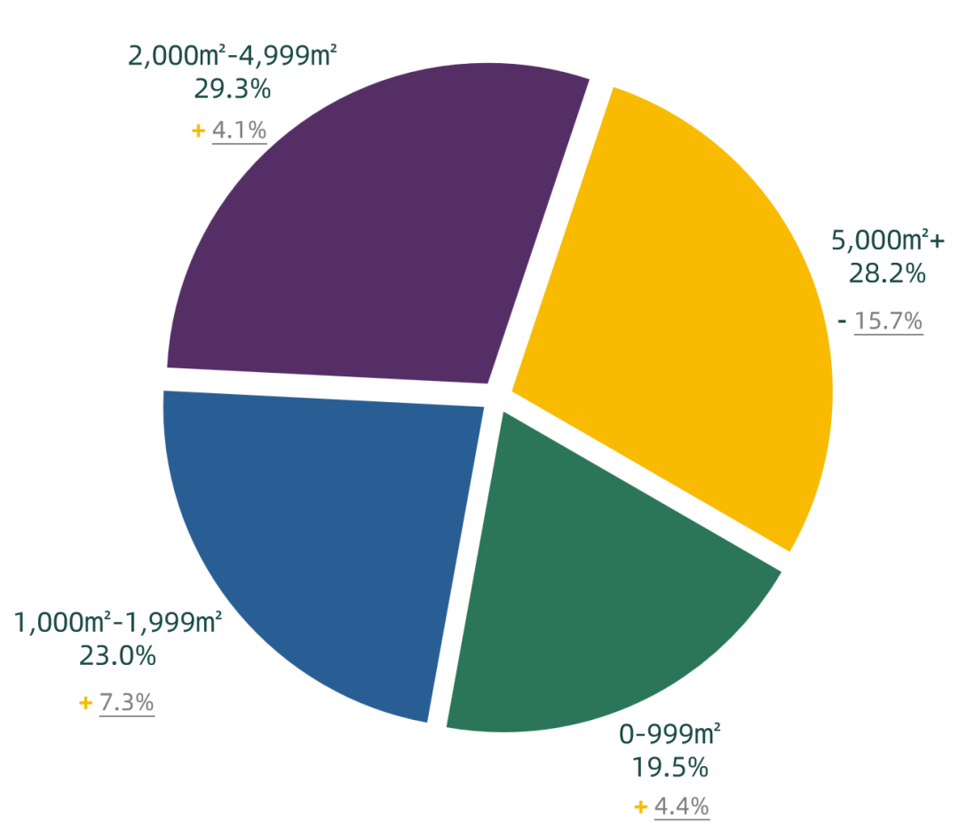 從2023 年第二季度寫字樓成交面積來(lái)看,本季度 2,000-4,999 平方米的成交面積占比最大,為 29.3% ;超過(guò) 5,000 平方米的成交面積占比為 28.2% ,環(huán)比上季度降低 15.7 個(gè)百分點(diǎn),其他各類成交面積占比均有一定程度上升。