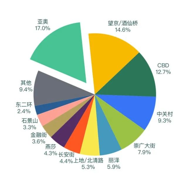 2023年第二季度,亞奧、望京 / 酒仙橋、 CBD 、中關(guān)村商圈是本季度成交的熱點(diǎn)區(qū)域,占比超過(guò)全市成交面積的 50% 。亞奧商圈在本季度成交面積占比為 17.0% ,望京 / 酒仙橋商圈成交面積占比為 14.6% , CBD 商圈成交面積占比為 12.7% ,中關(guān)村商圈成交面積占比為 9.3% 。