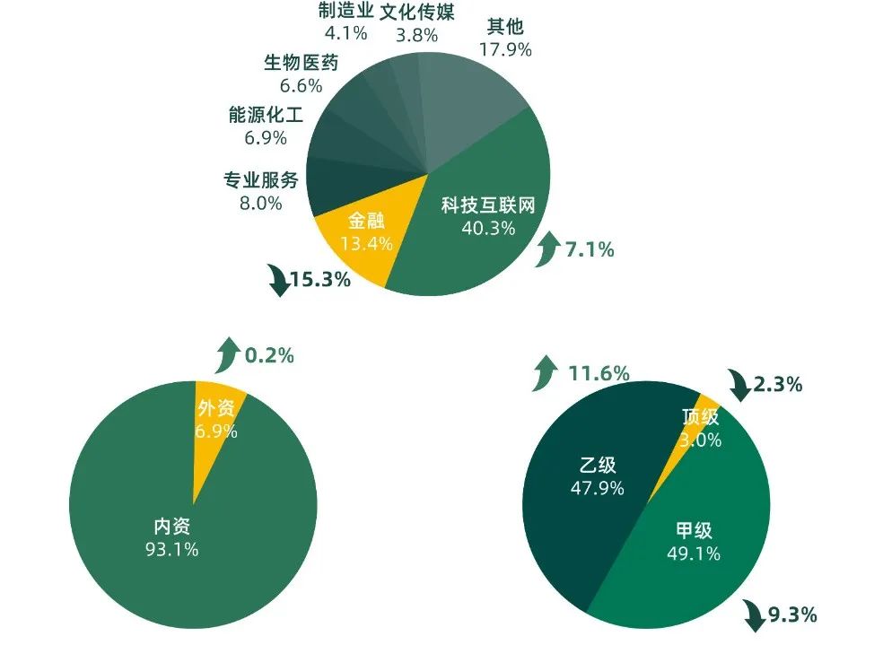科技互聯(lián)網(wǎng)、金融、專業(yè)服務(wù)行業(yè)仍是市場(chǎng)成交的主要來(lái)源,金融行業(yè)成交面積占比下降明顯,降低15.3個(gè)百分點(diǎn),科技互聯(lián)網(wǎng)行業(yè)成交面積占比上升顯著,環(huán)比上升 7.1個(gè)百分點(diǎn) 。