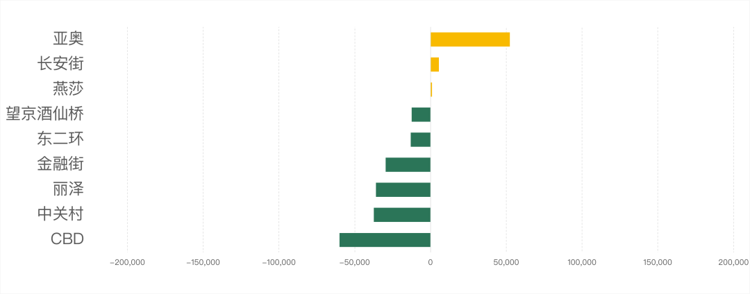 2023年第二季度,從各商圈成交面積來(lái)看,亞奧商圈本季度表現(xiàn)活躍,成交面積增長(zhǎng)超 5 萬(wàn)平方米; CBD 商圈本季度成交面積下降明顯,約 6 萬(wàn)平方米;除長(zhǎng)安街、燕莎商圈外,其他商圈成交面積環(huán)比上季度均呈現(xiàn)不同程度降低。