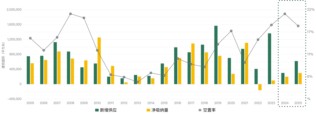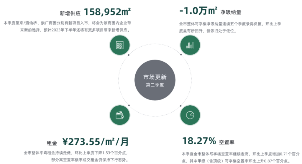 2023年第二季度受整體市場(chǎng)受整體市場(chǎng)壓力及租金下行影響,凈吸納量雖有所回升,但仍錄得負(fù)值??罩寐室惨蛐马?xiàng)目入市及部分企業(yè)退租、縮減面積而繼續(xù)呈上行態(tài)勢(shì)。