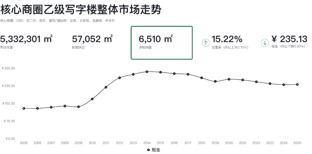 本季度核心商圈整體乙級(jí)寫字樓凈吸納量為6,510 平方米。乙級(jí)寫字樓的空置率環(huán)比上季度上升 0.79 個(gè)百分點(diǎn),錄得 15.22% ;成交租金仍呈下行趨勢(shì),環(huán)比上季度下降 0.93 個(gè)百分點(diǎn)至每平方米每月 235.13 元。其中 CBD 、金融街、亞奧商圈的成交租金降幅相對(duì)明顯,環(huán)比上季度降幅均超過(guò) 1.0 個(gè)百分點(diǎn)。