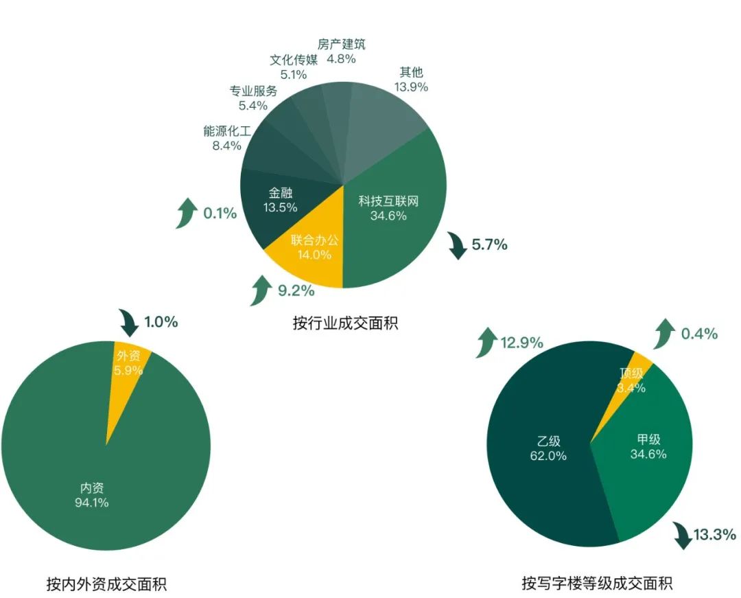 從本季度內外資成交面積來看,外資企業成交面積占比下降1.0個百分點,成交數量占比下降1.6個百分點。從樓宇等級成交面積來看,當下眾多企業受宏觀經濟環境影響,多采取控本為主的保守租賃策略,故本季度乙級寫字樓成交占比增幅明顯,環比上升12.9個百分點。