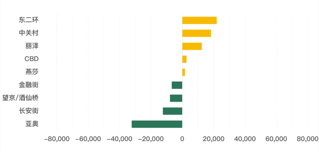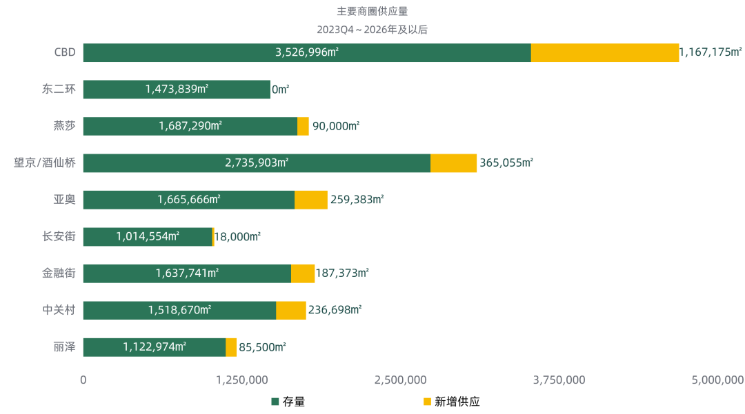 在2023-2026年,全市主要商圈新增供應量主要集中在CBD、望京/酒仙橋與亞奧商圈。金融街、中關村、麗澤、燕莎商圈也將有新的寫字樓項目陸續投入市場。雖有部分項目受市場壓力暫緩入市,但預計2023年底,仍有部分新增項目和多個城市更新項目計劃投入市場,為在當下買方市場進行樓宇品質升級、降本增效的企業提供了更多的選擇。