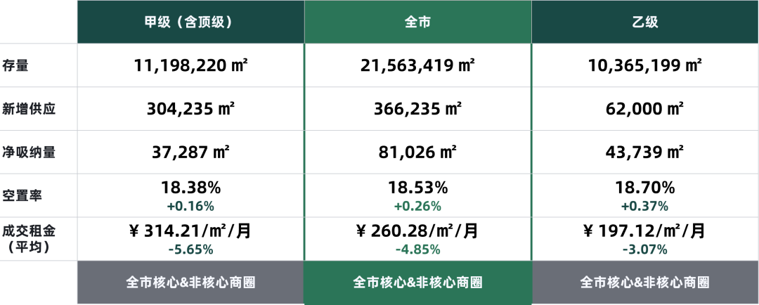 其中甲級(含頂級)寫字樓成交租金環比下降5.65個百分點,為每平方米每月314.21元;乙級寫字樓成交租金環比下降3.07個百分點,錄得每平方米每月197.12元。