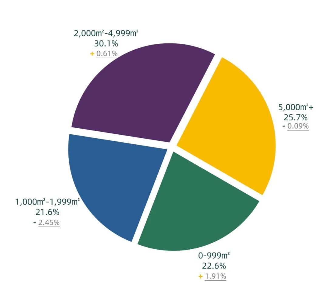 從2023年第三季度寫字樓成交面積來看,本季度2,000-4,999平方米的成交面積占比最大,為30.1%;超過5,000平方米的成交面積占比為25.7%,環比上季度降低0.09個百分點;0-999平方米的成交面積占比為22.6%,環比上季度上升1.91個百分點;1,000-1,999平方米的成交面積占比為21.6%,環比上季度降低2.45個百分點。