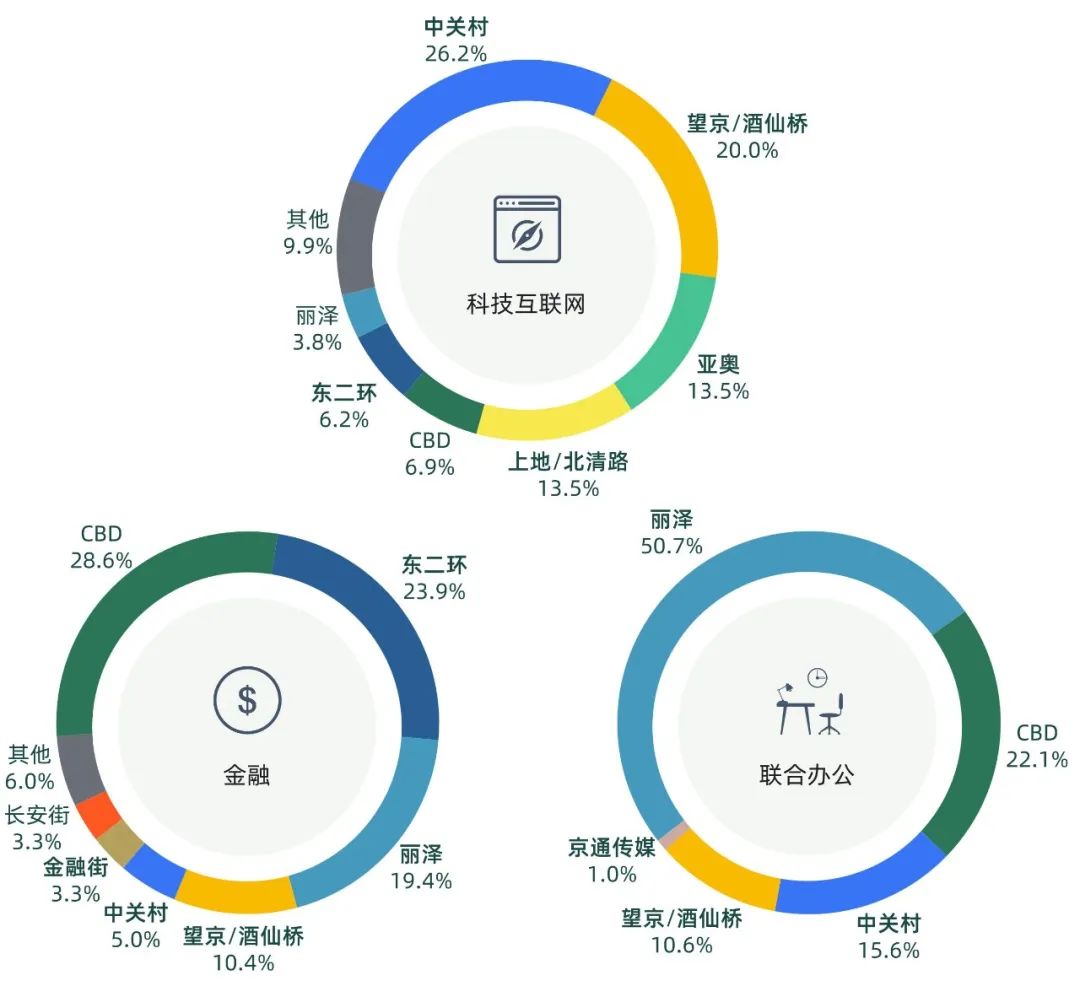 CBD、東二環和麗澤商圈是金融行業在本季度的主要成交區域,本季度金融行業在上述商圈成交面積占比均有明顯增加。聯合辦公行業成交面積有顯著上升,其中麗澤、CBD、中關村商圈占據了本季度該行業約九成的成交面積,環比上季度成交面積上升4萬平方米。