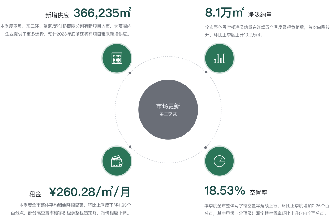2023年第三季度受宏觀經濟環境及市場壓力影響,市場活躍度低于預期,租金持續下行。凈吸納量雖由負轉正、全市整體寫字樓需求及成交面積有小幅上升,但空置率也因新項目入市而繼續呈上行態勢。