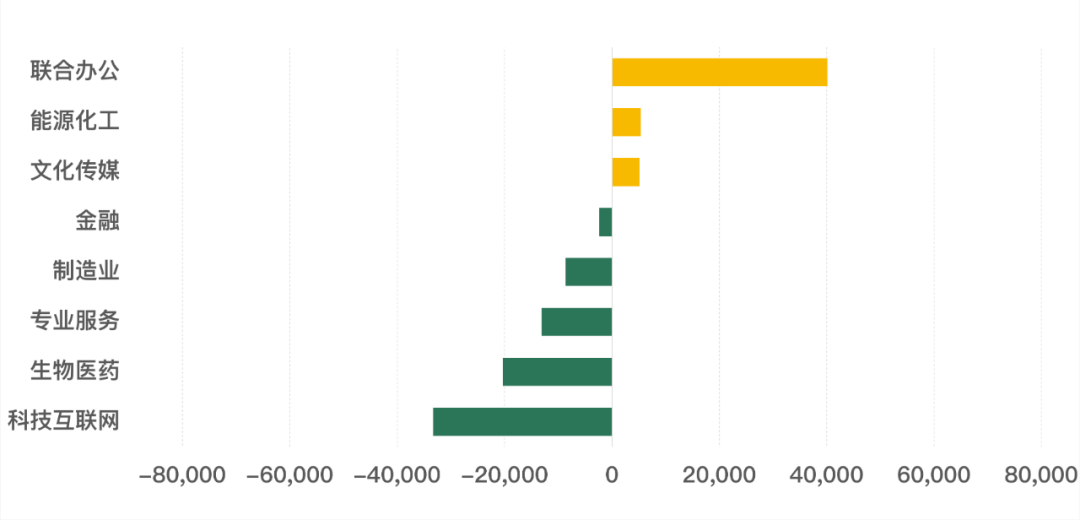 2023年第三季度,從行業成交面積來看,聯合辦公行業環比上季度成交面積上升超過4萬平方米;能源化工、文化傳媒行業本季度成交面積環比上季度均有小幅上升。金融、制造業、專業服務、生物醫藥、科技互聯網行業均有所下降,其中科技互聯網行業成交面積環比下降超3萬平方米。