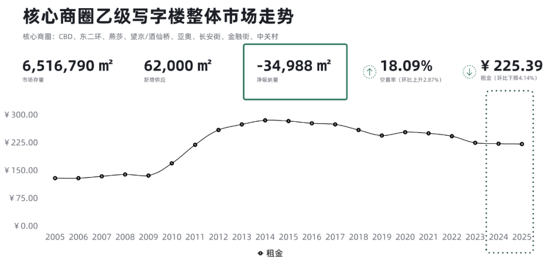 本季度核心商圈整體乙級寫字樓凈吸納量為-34,988平方米。乙級寫字樓的空置率環比上季度上升2.87個百分點,錄得18.09%;成交租金降幅顯著,環比上季度下降4.14個百分點至每平方米每月225.39元。其中金融街、中關村商圈的成交租金降幅明顯,環比上季度降幅均超過10個百分點。