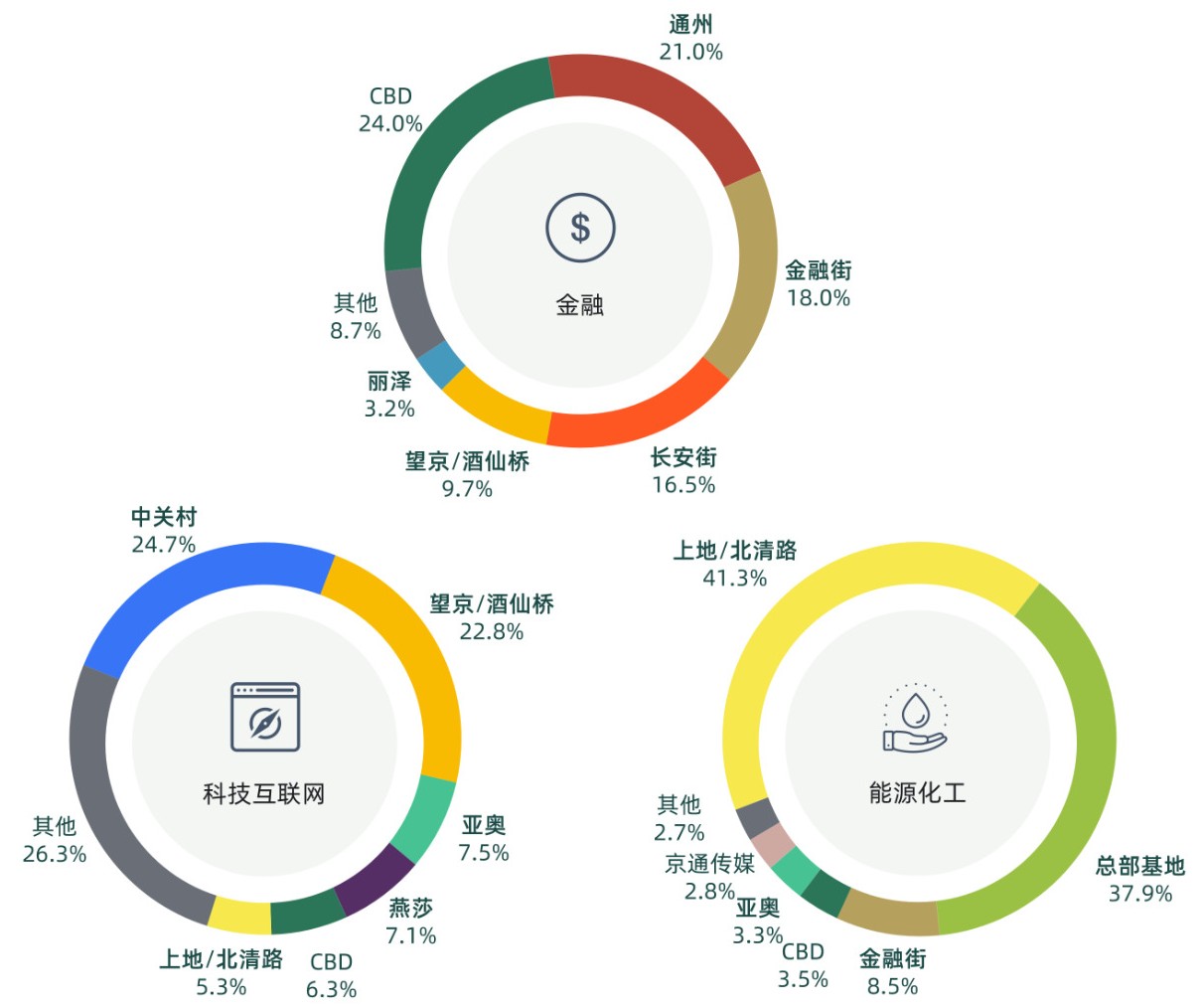 金融行業(yè)本季度主要成交面積為CBD、通州、金融街和長安街商圈,上述商圈本季度該行業(yè)成交面積占比超過全市的七成;受總部疏解政策影響,通州商圈成交面積占比有顯著增加。
