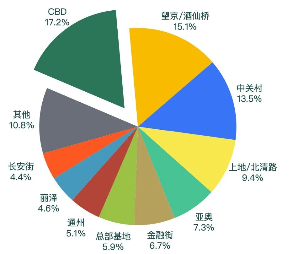 2024年第二季度,CBD、望京/酒仙橋、中關(guān)村、上地/北清路商圈是本季度成交的熱點(diǎn)區(qū)域,占比約為全市成交面積的50%。CBD商圈成交面積占比17.2%,望京/酒仙橋商圈在本季度成交面積占比為15.1%,中關(guān)村商圈成交面積占比為13.5%,上地/北清路商圈成交面積占比為9.4%。