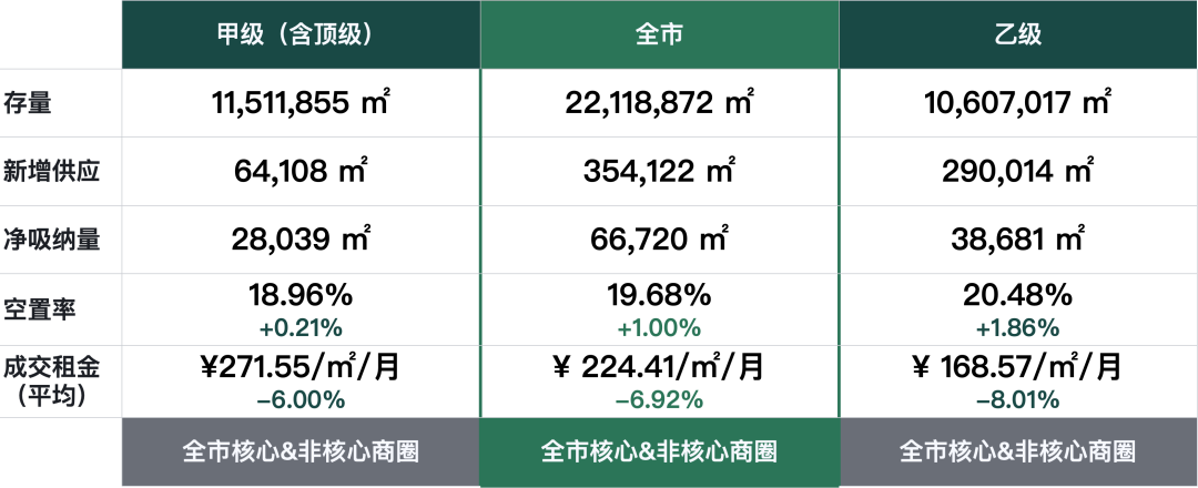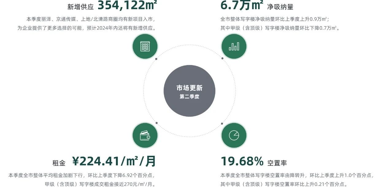 2024年第二季度,全市甲級(含頂級)、乙級寫字樓新租/搬遷需求及成交面積環(huán)比上季度均有回升。