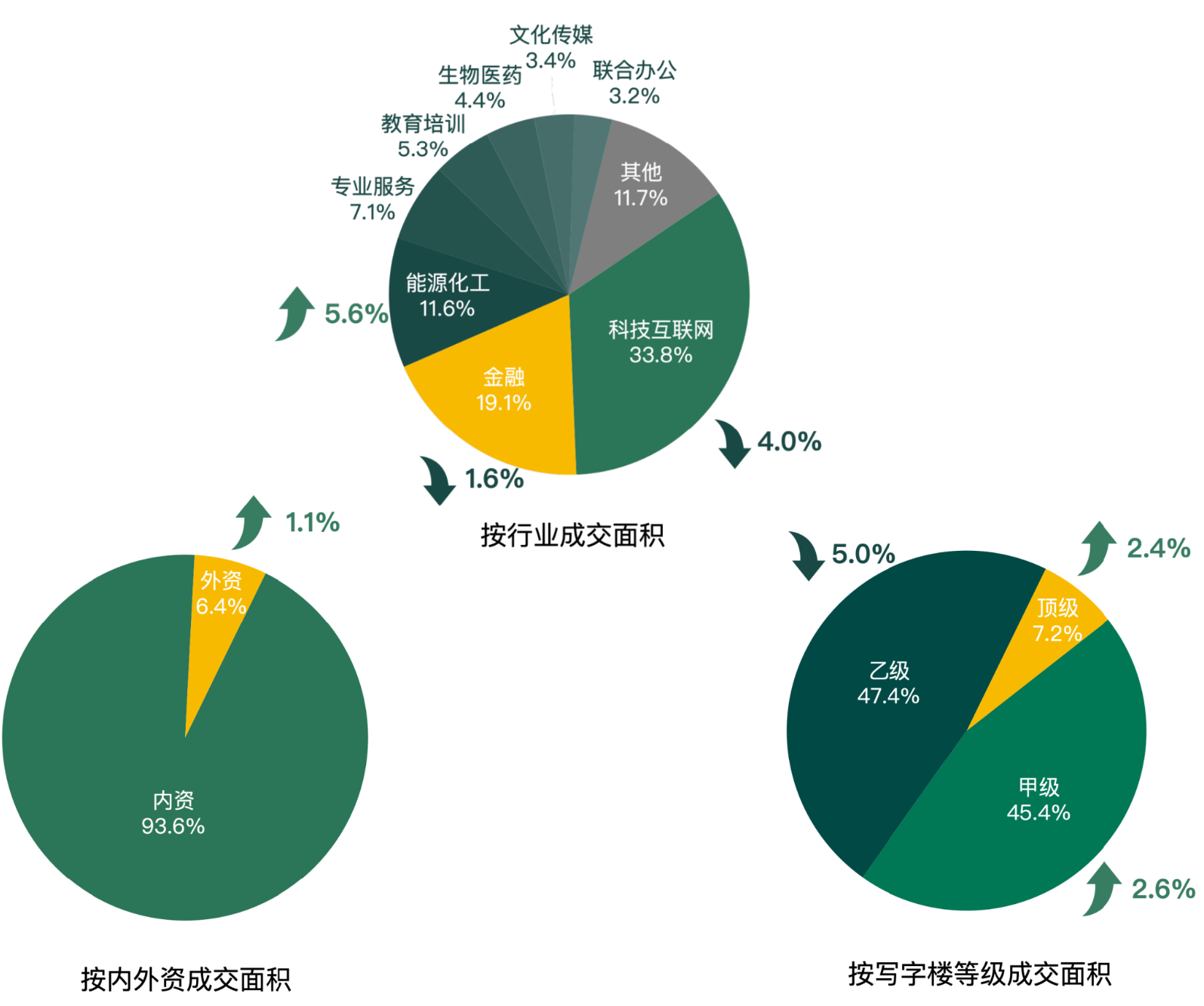 從行業(yè)成交面積來看,能源化工、科技互聯(lián)網(wǎng)行業(yè)環(huán)比上季度成交面積上升均超過3萬平方米;金融、專業(yè)服務(wù)、教育培訓(xùn)、文化傳媒行業(yè)成交面積亦有所增長。零售快消及制造業(yè)成交面積占比降低。
