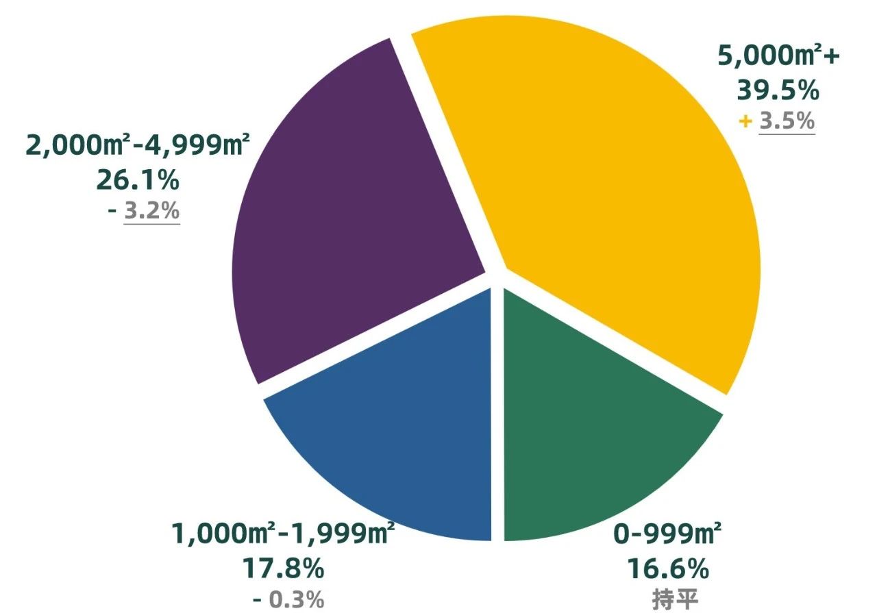 從本季度寫字樓成交面積來看,本季度超過5,000平方米的成交面積占比最大,為39.5%,環(huán)比上升3.5個(gè)百分點(diǎn);2,000-4,999平方米的成交面積占比為26.1%,環(huán)比降低3.2個(gè)百分點(diǎn);1,000-1,999平方米的成交面積占比為17.8%,環(huán)比降低0.3個(gè)百分點(diǎn);0-999平方米的成交面積占比為16.6%,環(huán)比無變化。