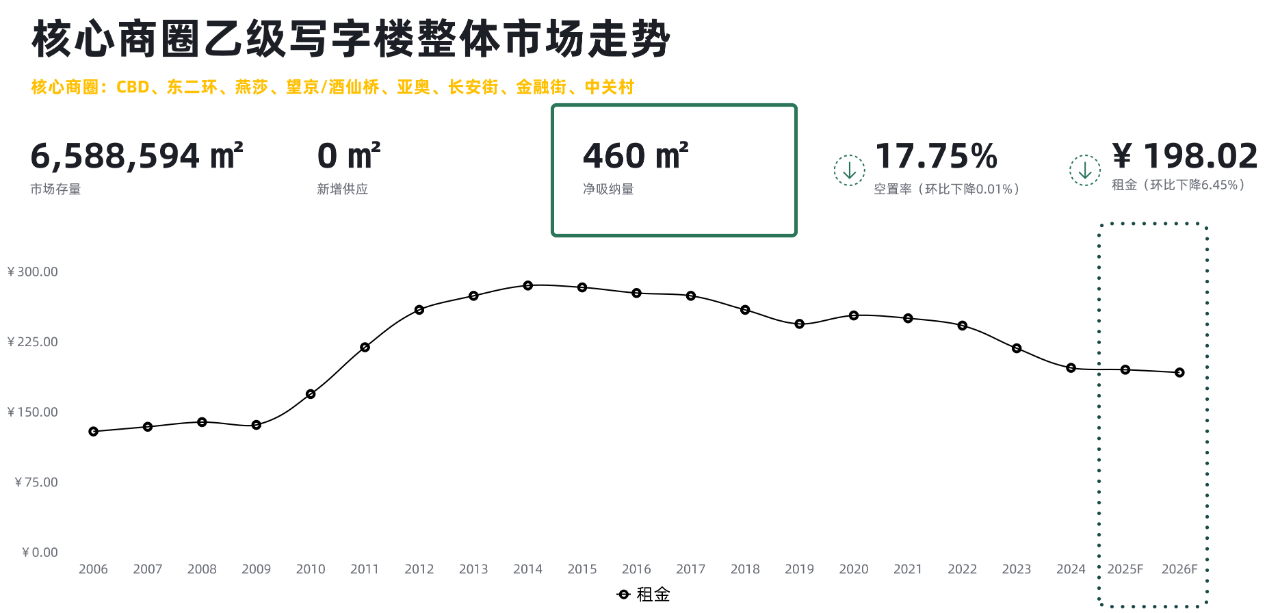 本季度核心商圈整體乙級寫字樓凈吸納量為460平方米。乙級寫字樓的空置率環(huán)比上季度下降0.01個(gè)百分點(diǎn),錄得17.75%;成交租金下行趨勢加劇,環(huán)比上季度下降6.45個(gè)百分點(diǎn),跌至每平方米每月198.02元。其中長安街、CBD商圈的成交租金降幅明顯,環(huán)比降幅在9.0個(gè)百分點(diǎn)及以上。