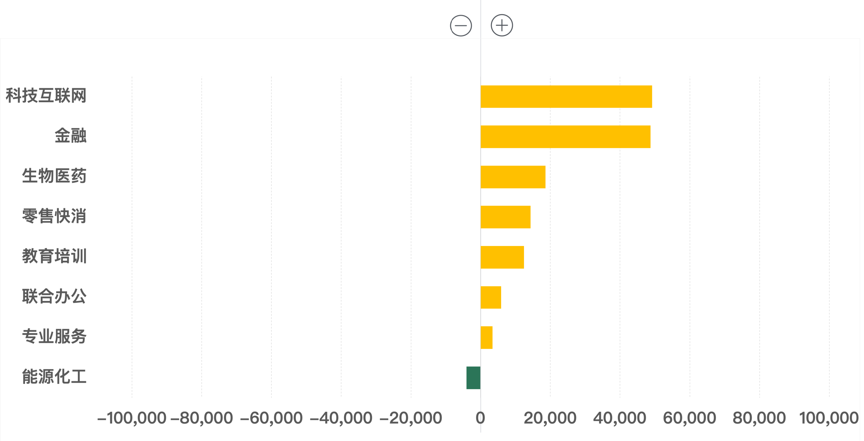 從行業成交面積來看,科技互聯網、金融行業成交面積環比上季度漲幅均接近5萬平方米,生物醫藥、零售快消、教育培訓行業成交面積環比上季度漲幅超1萬平方米,聯合辦公和專業服務行業成交面積環比均有增長,能源化工行業成交面積環比回落。