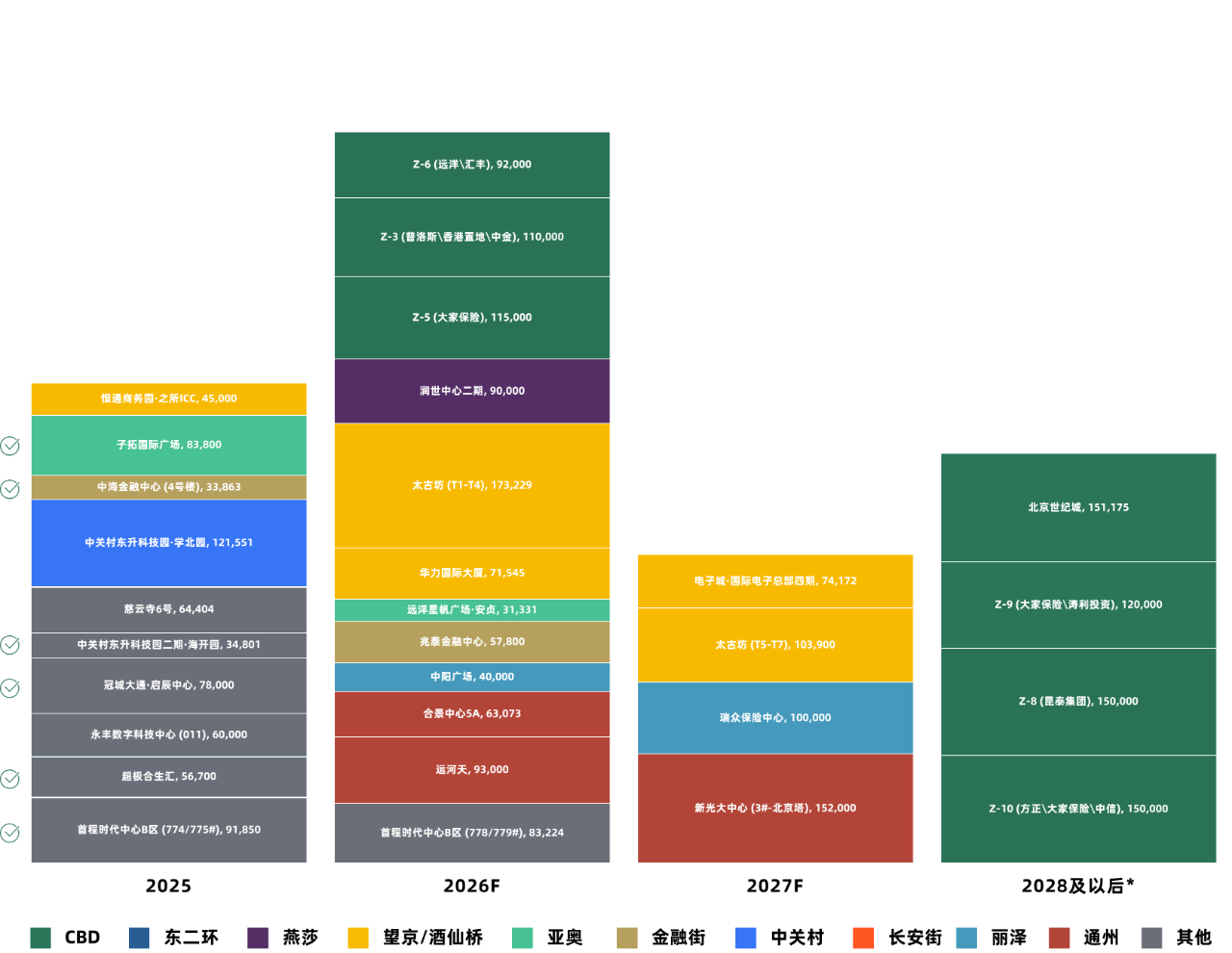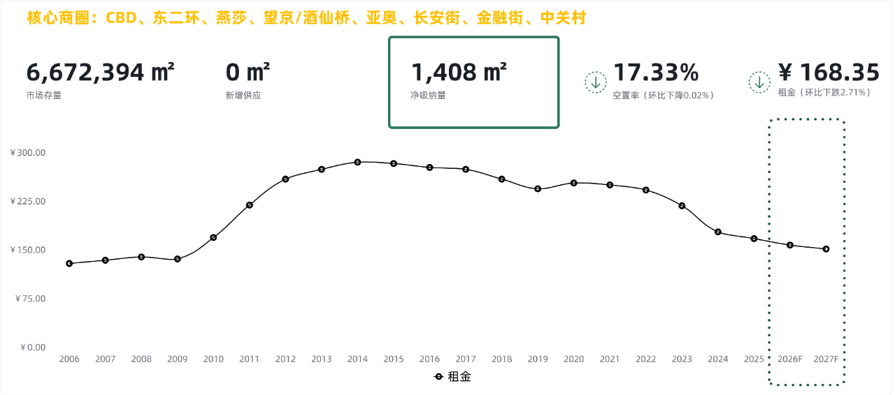 北京寫字樓市場在近兩年將有接近170萬平方米存量投入市場,在這當中甲級寫字樓占比超過整體的七成,達到120萬平方米;且核心商圈多個細分市場將在2025年內釋放優質存量投入市場,供給端將有顯著的上升態勢,預測空置率將會受此影響承壓上行。成交租金將受市場競爭的影響,延長探底周期;而現階段的租金回調不斷在為后續價格調整創造空間,短期內市場還將存在高性價比的窗口期,匹配企業不斷增長的職場環境改善需求。