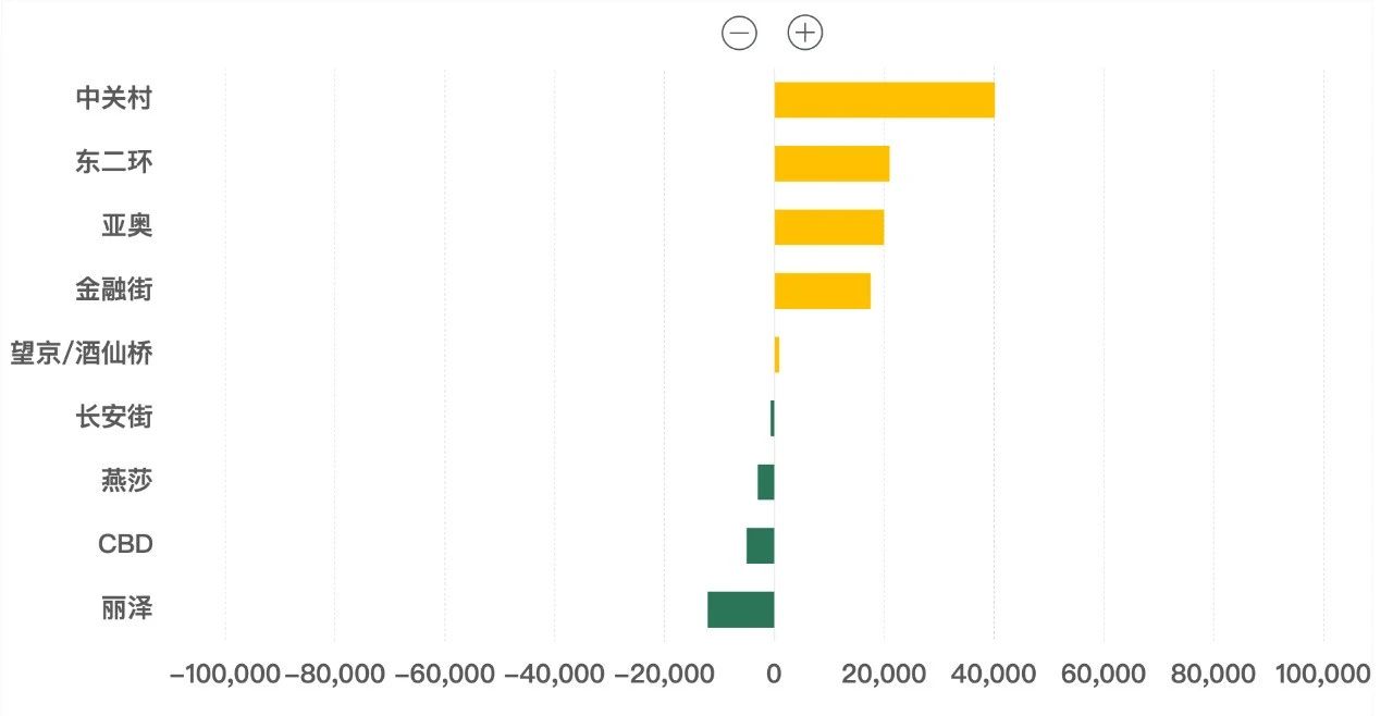 除亞奧和金融街商圈成交租金環比上季度降幅分別為3.6、3.3個百分點外,其他商圈成交租金跌幅均低于3.0個百分點。燕莎、中關村和CBD商圈成交租金降幅分別為2.9%、2.3%和2.2%。