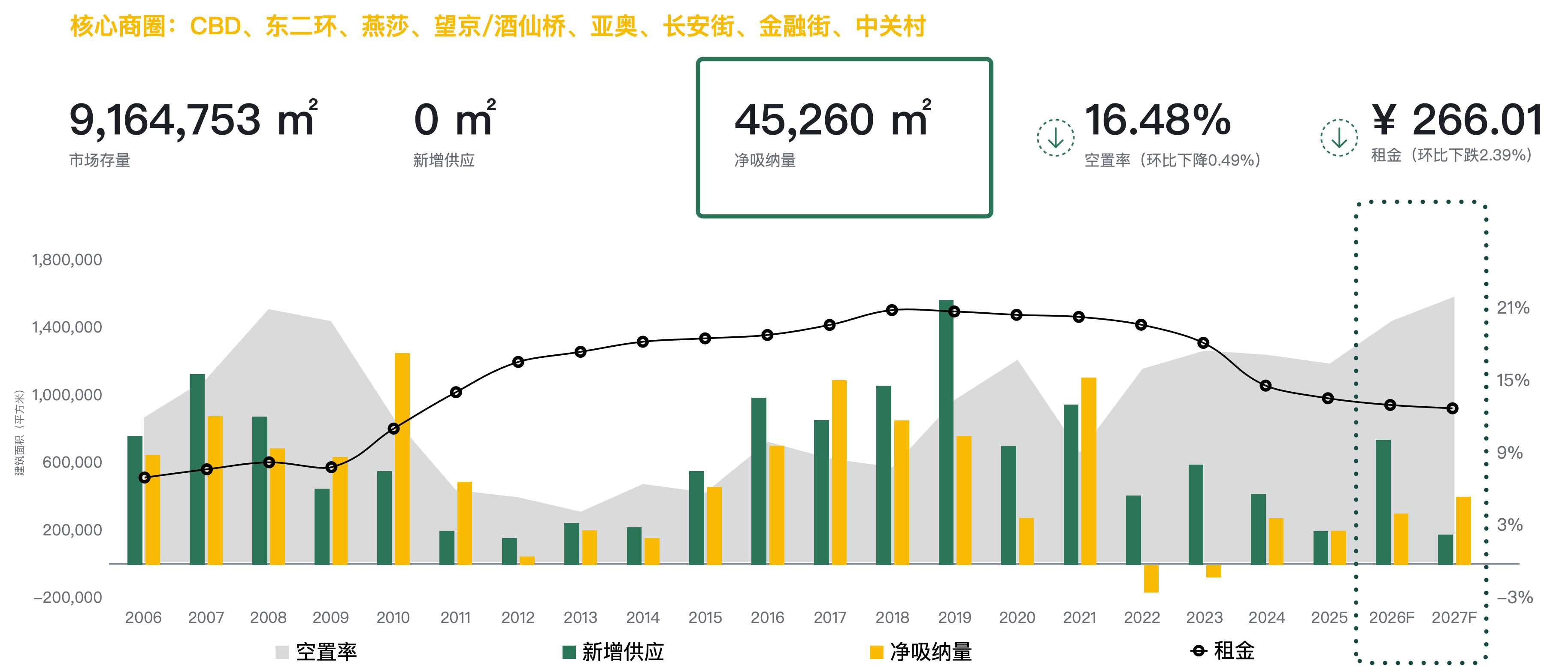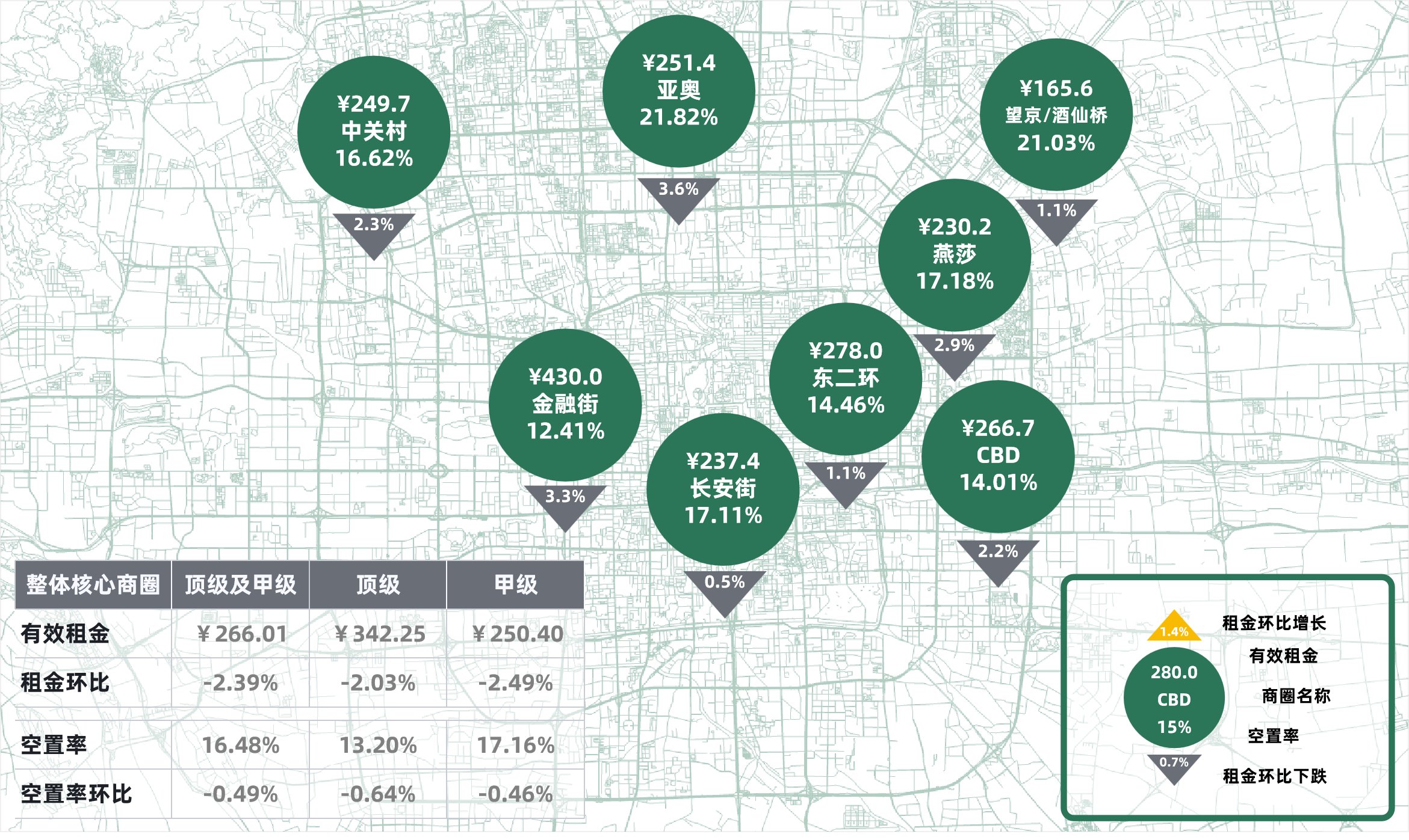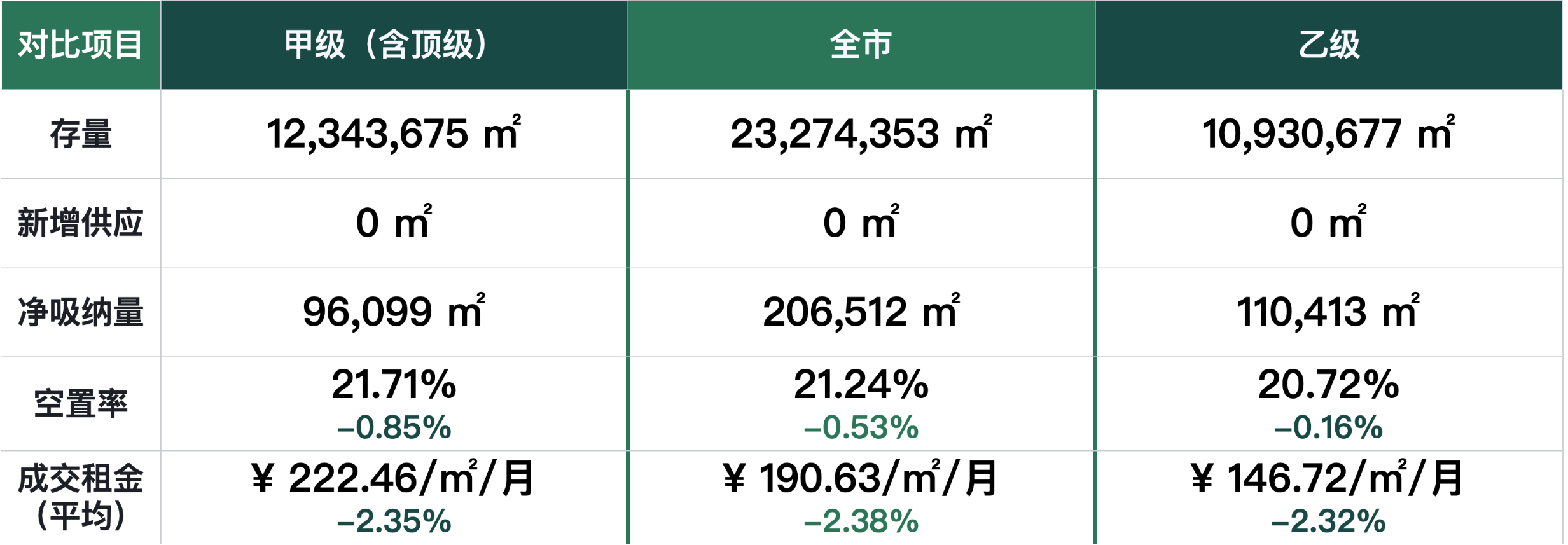 本季度核心商圈甲級(含頂級)寫字樓凈吸納量為45,260平方米,空置率環比下降0.49個百分點,錄得16.48%;成交租金延續下行,環比上季度下跌2.39個百分點,為每月每平方米266.01元。